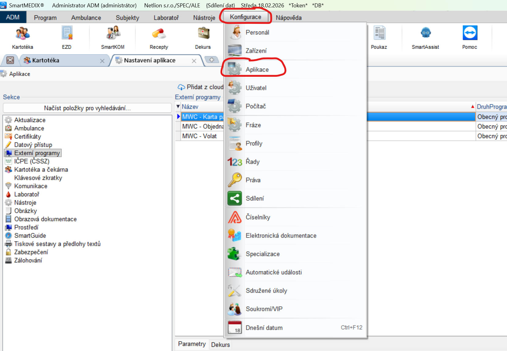 V hlavní nabídce klikněte na položku Konfigurace a po rozbalení nabídky klikněte na položku Aplikace.